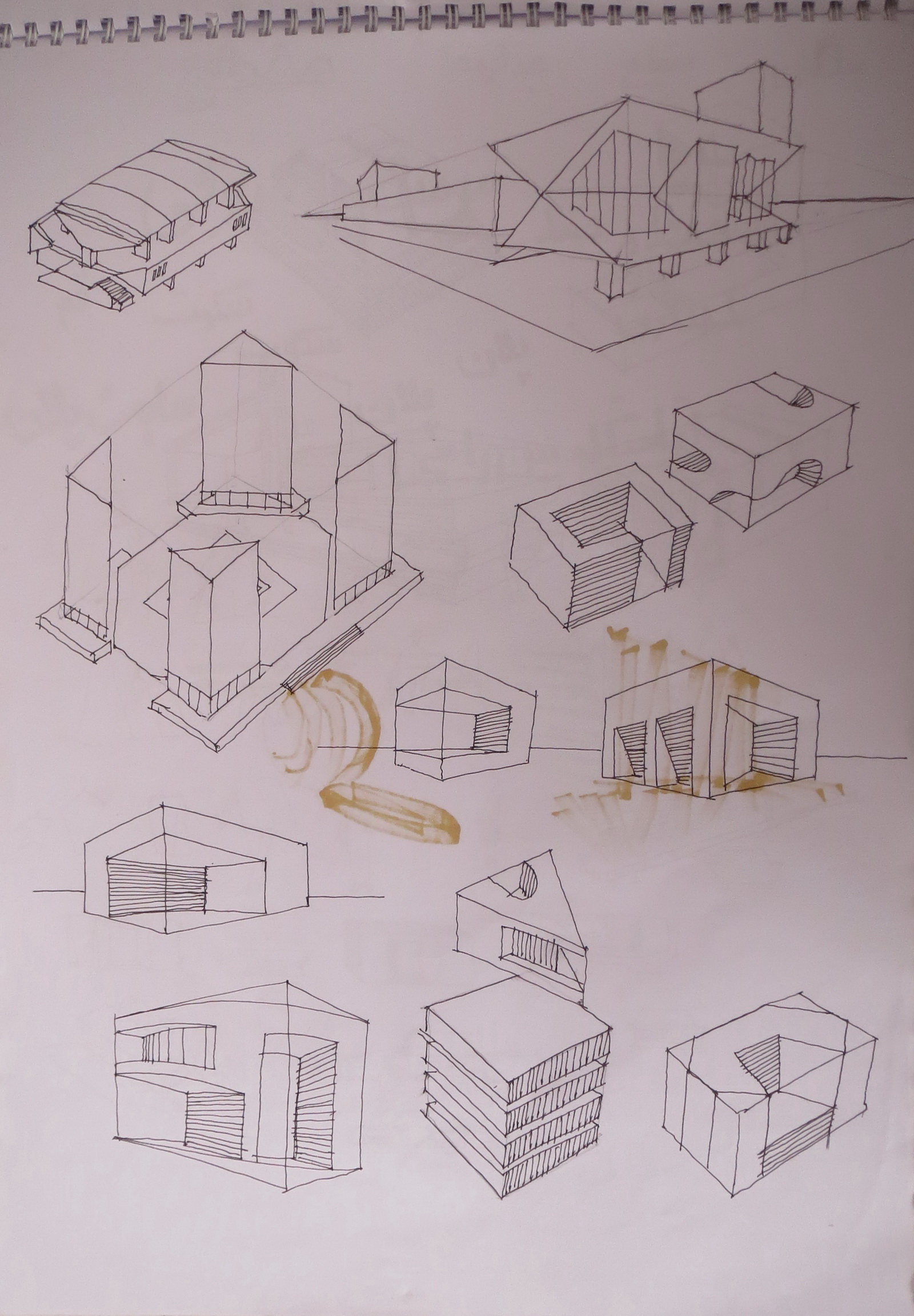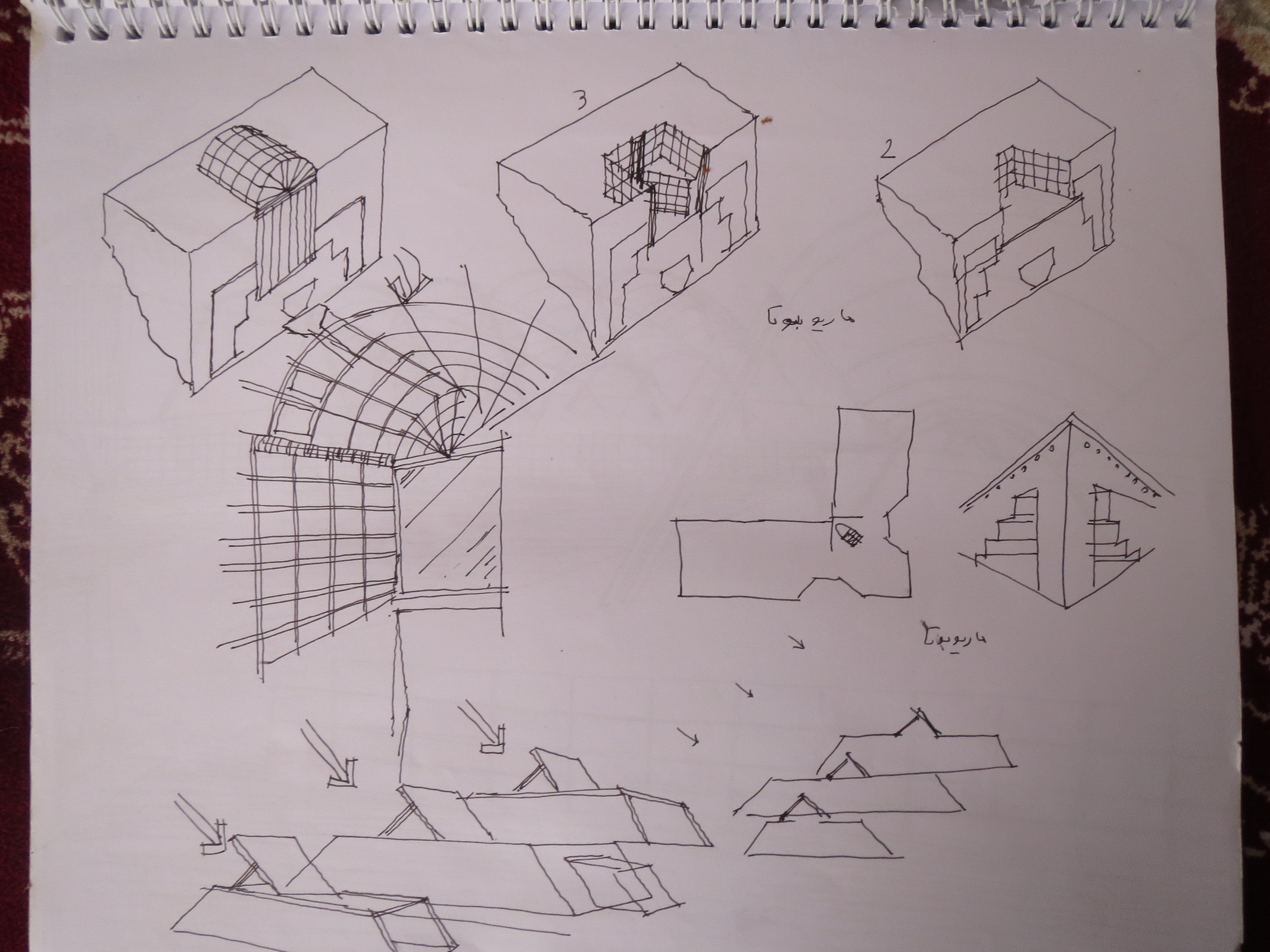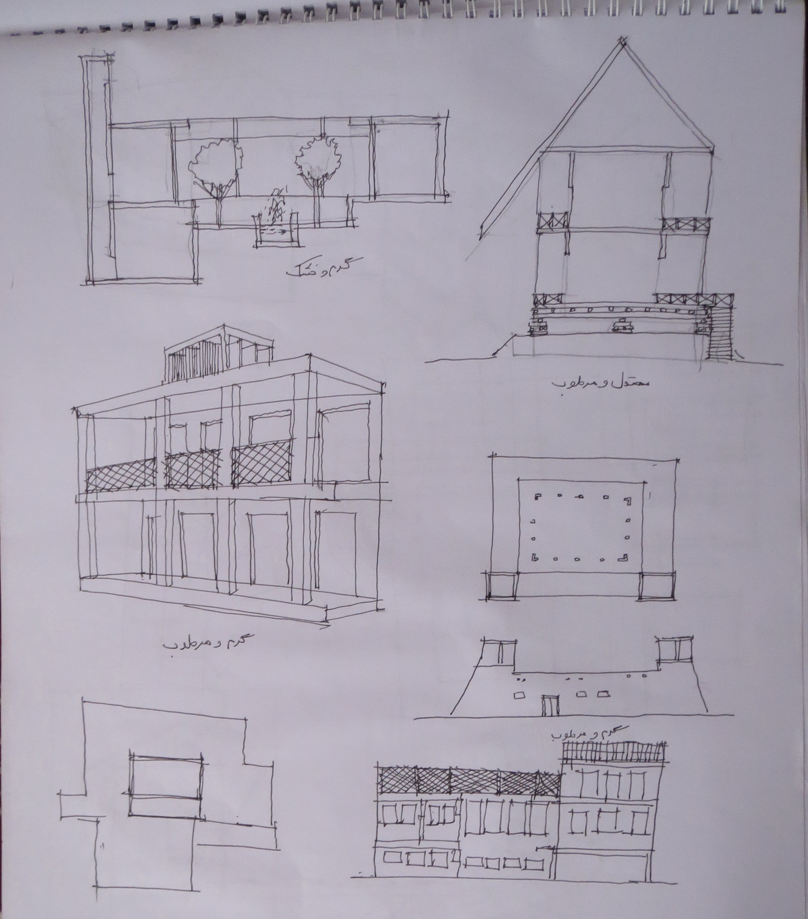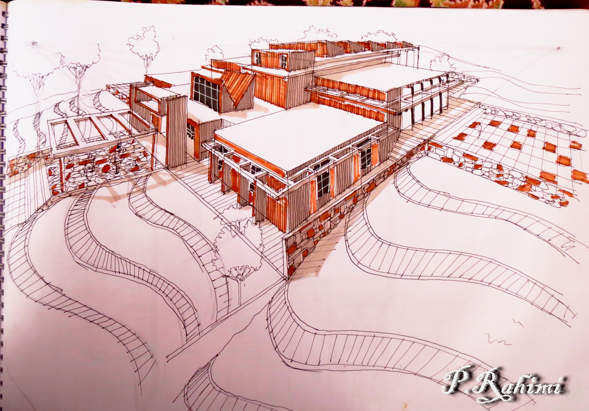 به نظرم کلیت کارات خوبه .. ولی مثلا اولین نکته ای که حس میشه اینه که فاصله گریزا نزدیکه به هم .. کار جمع شده وسط کاغذ .. یکم هم بیشتر به کف کار و اتصال بنا با زمین بپرداز ... مثلا با یه سری کفسازی. جلوی ورودی ..کلا منظورم اینه که یه کارایی بکنی که حجمت و راندوت خودشو پخش کنه تو شیت نه اینکه همه چی و همه رنگا جمع شه وسط بقیه شیت سفید بمونه ...این مطمئنا خیلی رو کیفیت کار تو نگاه اول تاثیر میذار ..