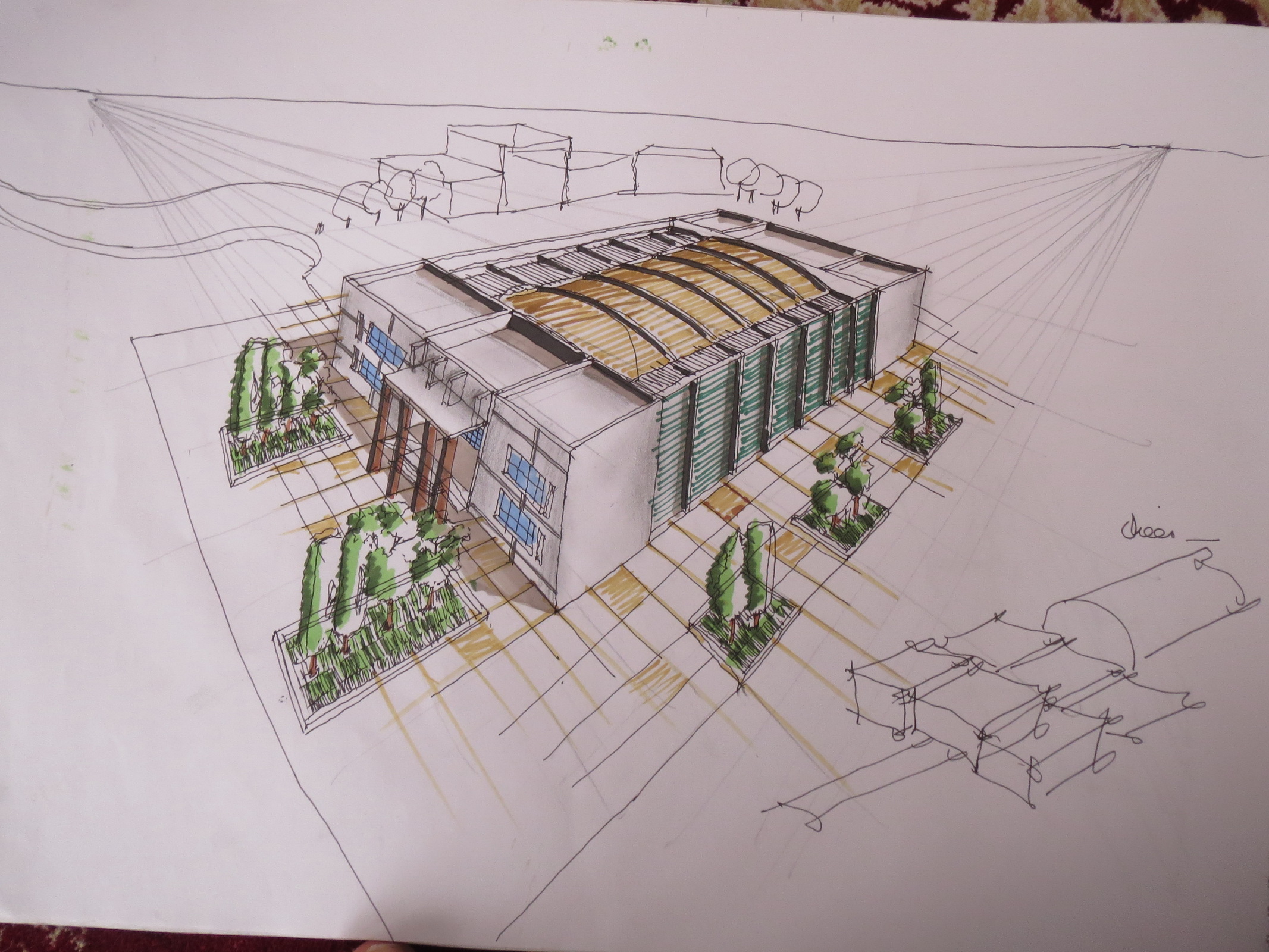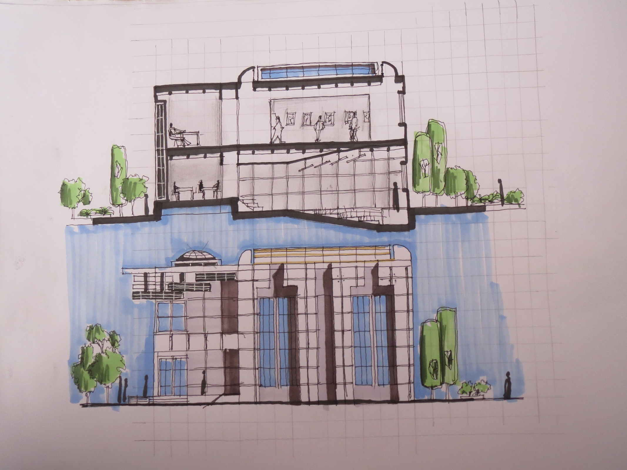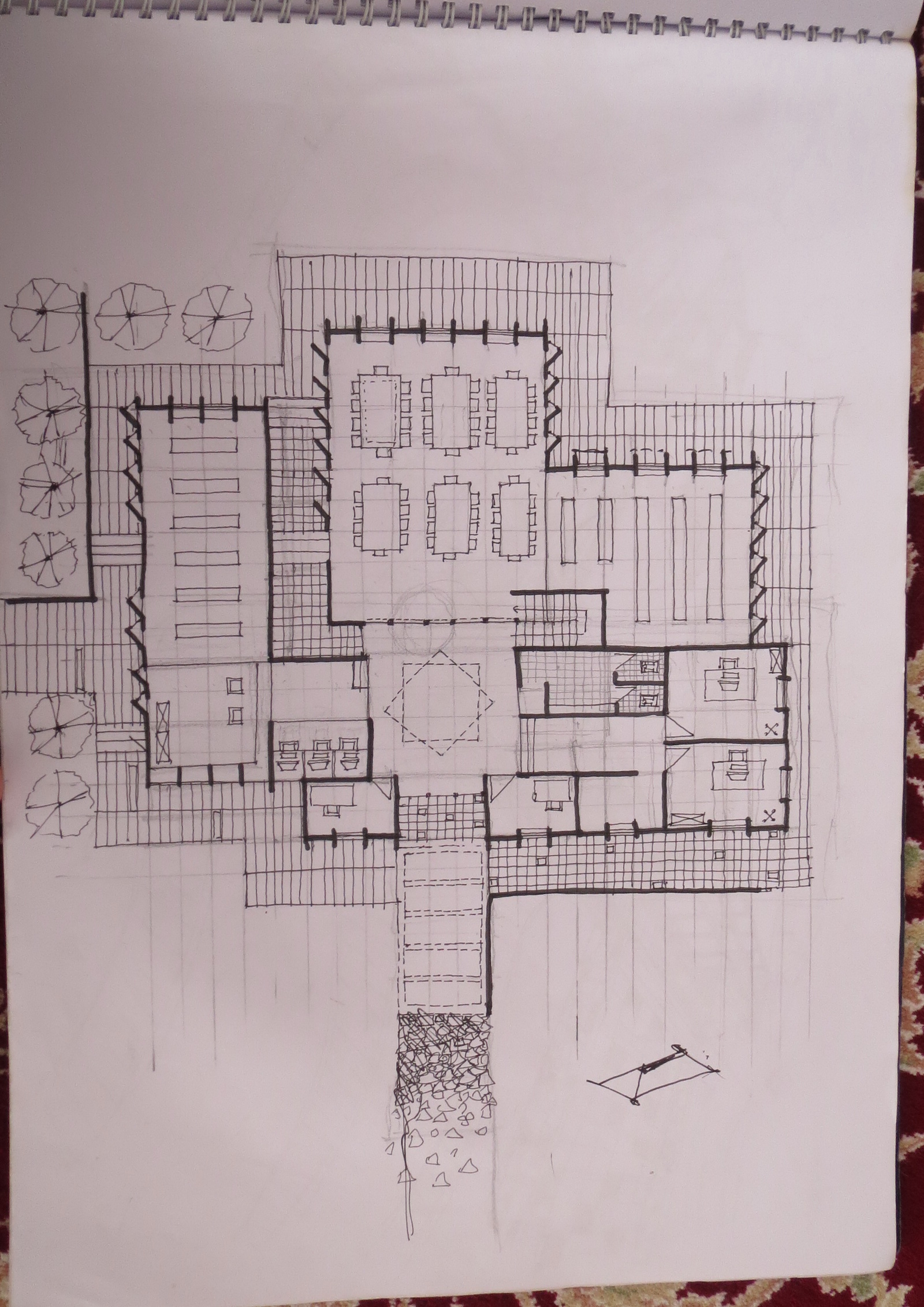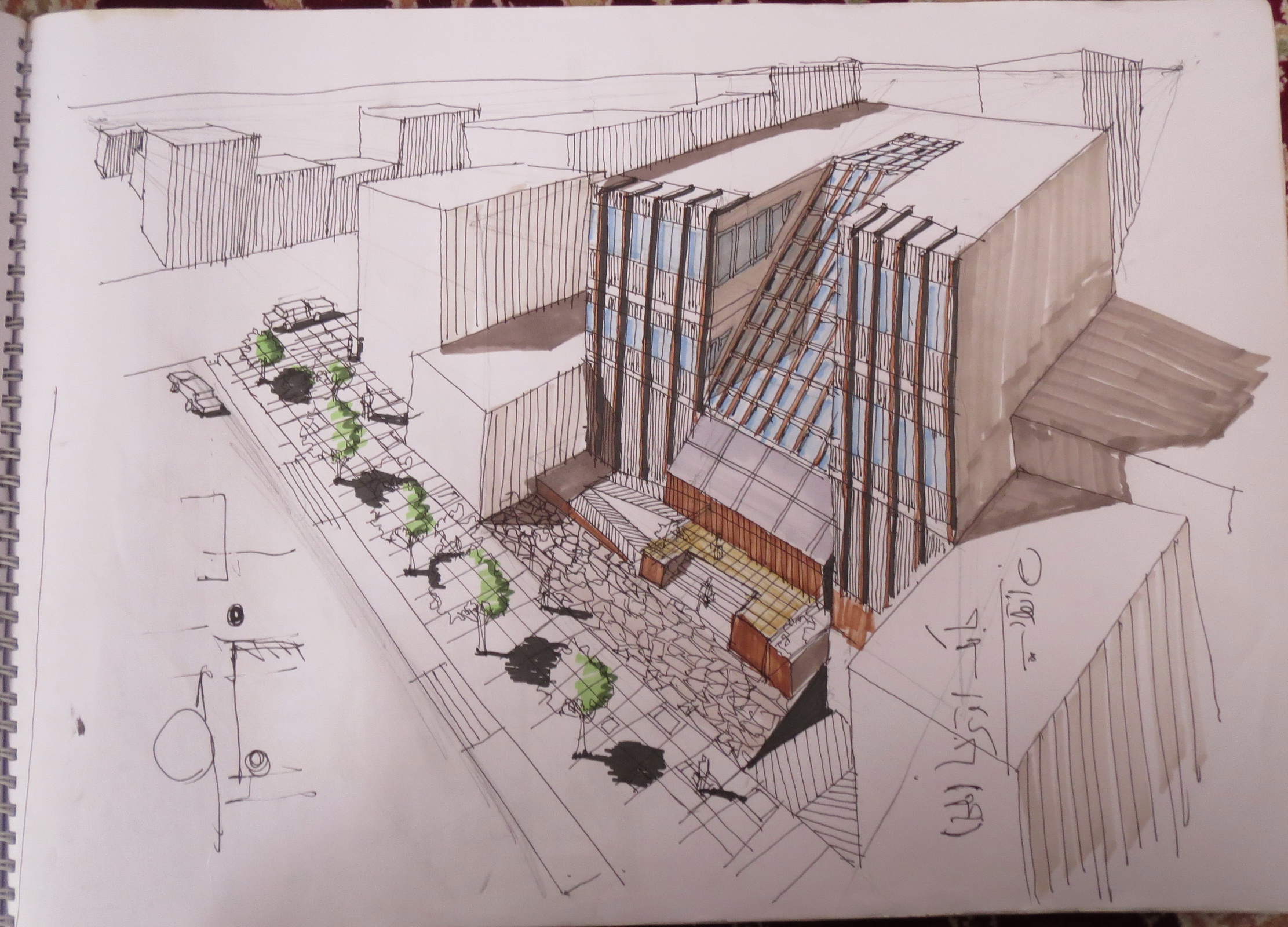 به نظرم کلیت کارات خوبه .. ولی مثلا اولین نکته ای که حس میشه اینه که فاصله گریزا نزدیکه به هم .. کار جمع شده وسط کاغذ .. یکم هم بیشتر به کف کار و اتصال بنا با زمین بپرداز ... مثلا با یه سری کفسازی. جلوی ورودی ..کلا منظورم اینه که یه کارایی بکنی که حجمت و راندوت خودشو پخش کنه تو شیت نه اینکه همه چی و همه رنگا جمع شه وسط بقیه شیت سفید بمونه ...این مطمئنا خیلی رو کیفیت کار تو نگاه اول تاثیر میذار ..