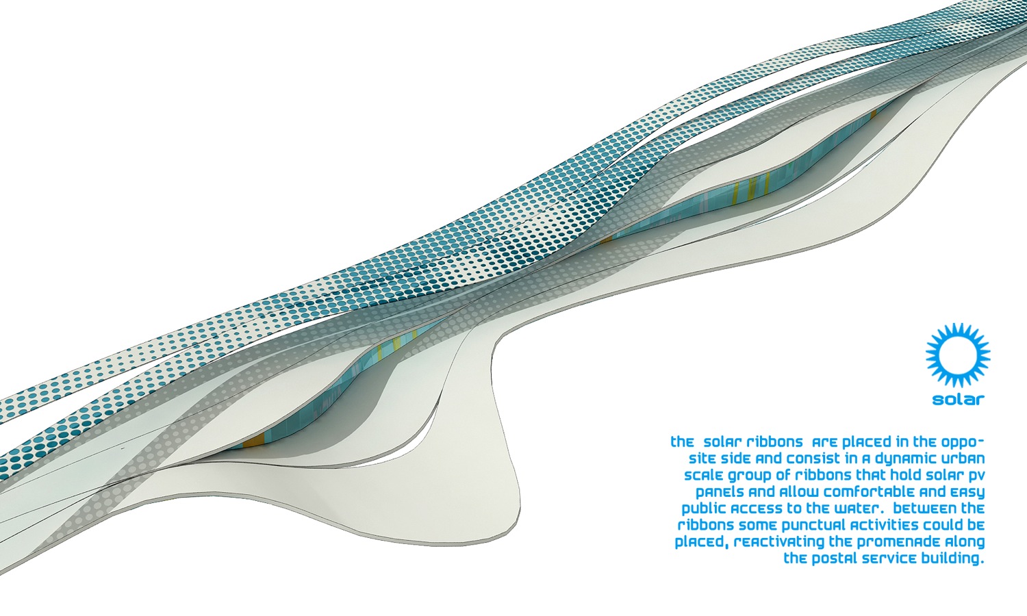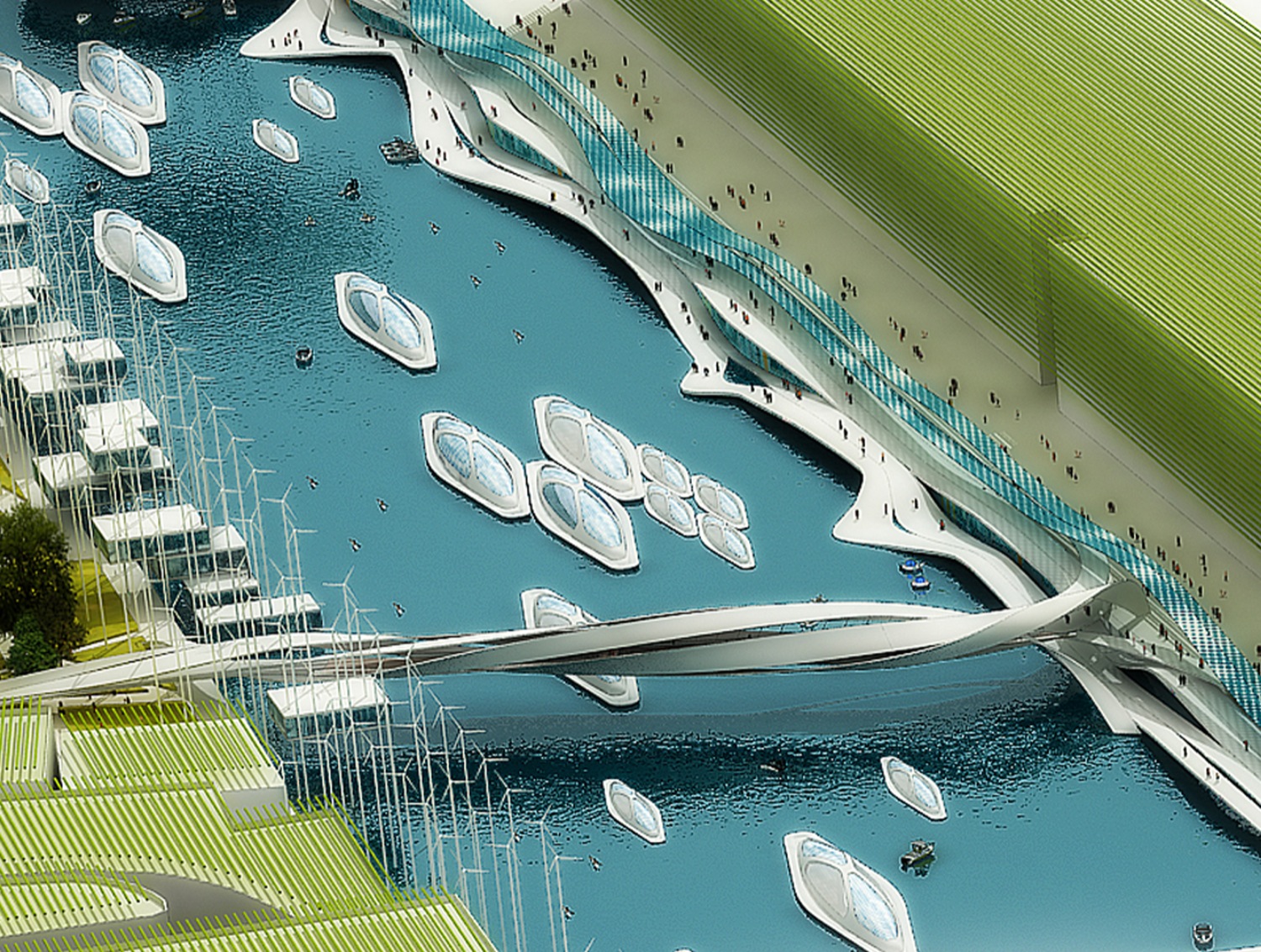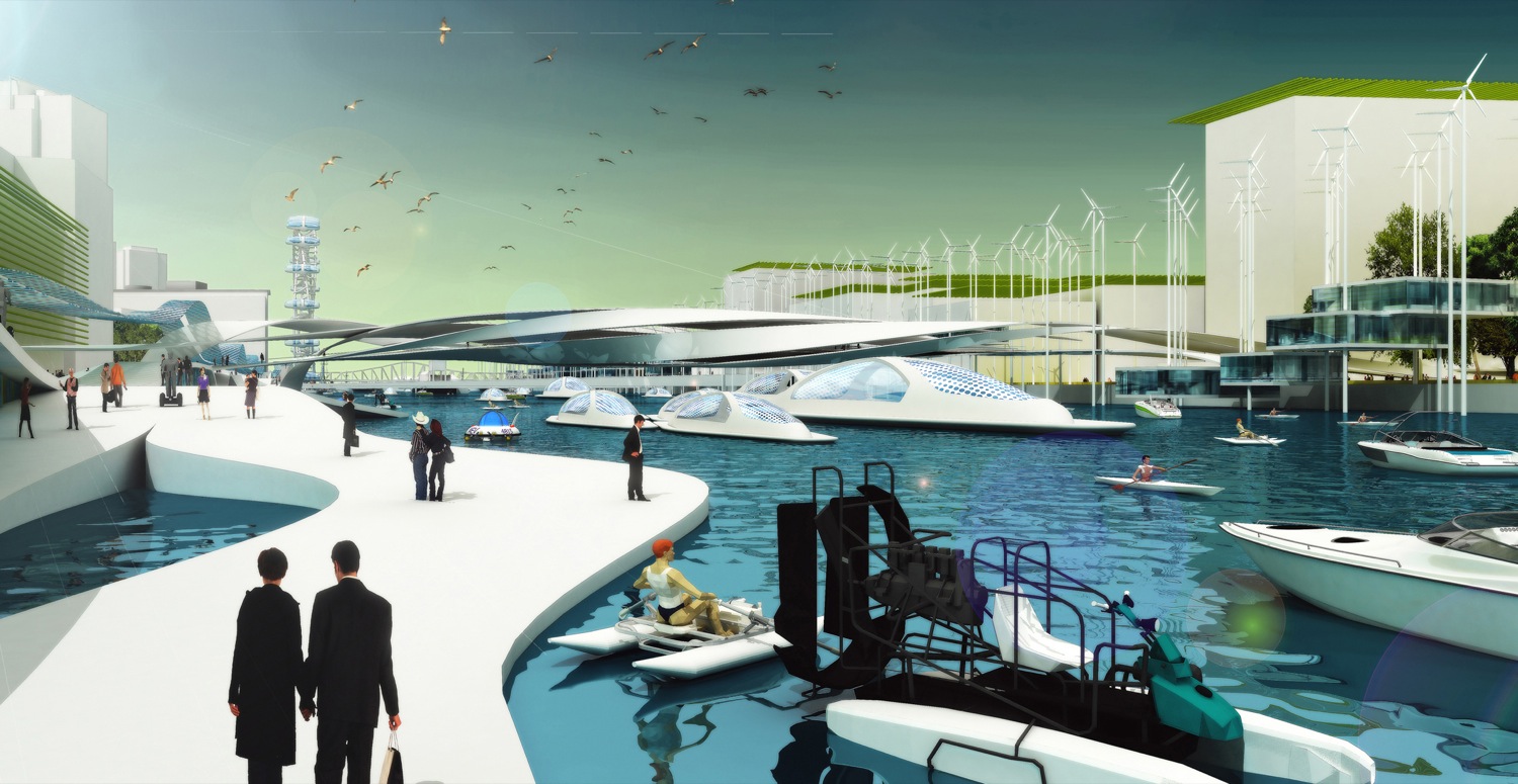 گروه معماری Influx Stadio بیشترین بهره را از این آب های وسیع برده و نوع ساختار و بافت شهر مذكور را با توجه به این بخش طراحی كرده است، به طوری كه پنل های مدور و قوس دار اطراف این آب ها علاوه بر القاء ظاهری جذاب و متفاوت به شهر، به جذب انرژی لازم از آب و تأمین آب شرب ساختمان های اطراف شهر كمك چشمگیری كرده است.