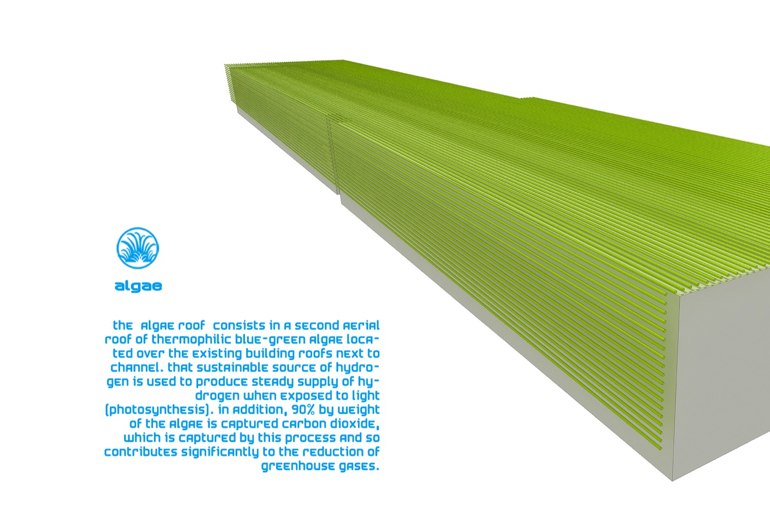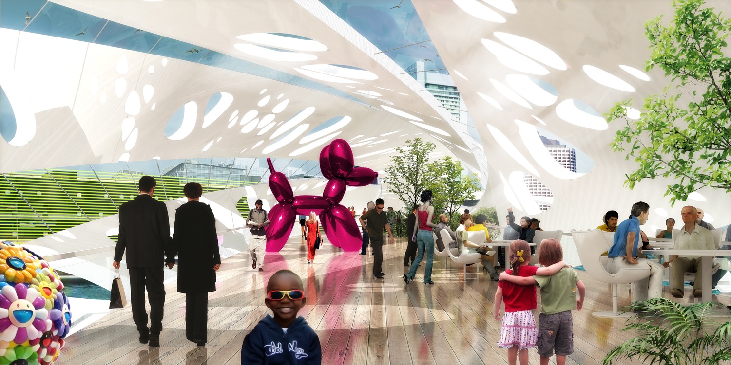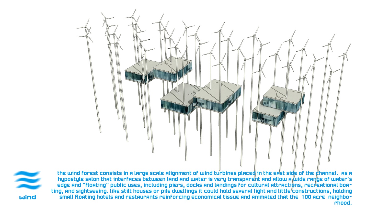 گروه معماری Influx Stadio بیشترین بهره را از این آب های وسیع برده و نوع ساختار و بافت شهر مذكور را با توجه به این بخش طراحی كرده است، به طوری كه پنل های مدور و قوس دار اطراف این آب ها علاوه بر القاء ظاهری جذاب و متفاوت به شهر، به جذب انرژی لازم از آب و تأمین آب شرب ساختمان های اطراف شهر كمك چشمگیری كرده است.