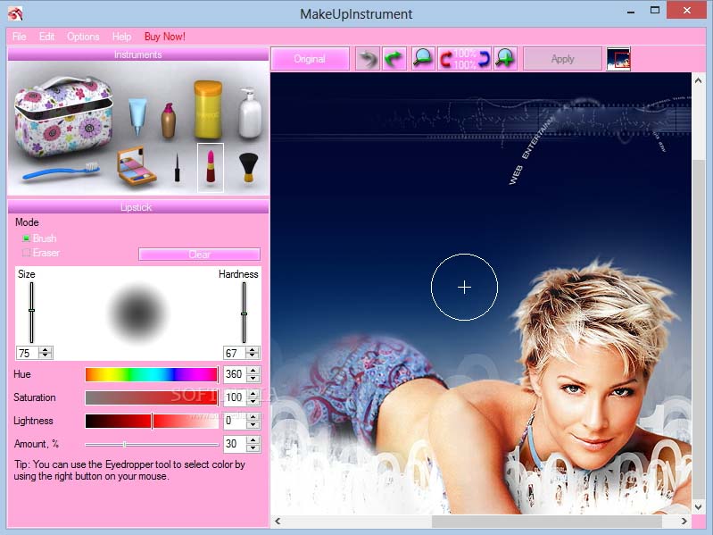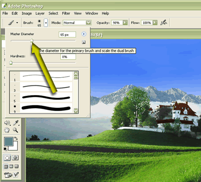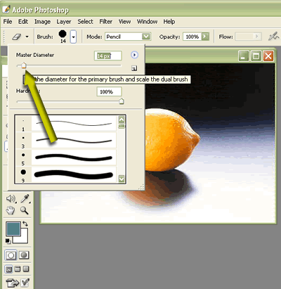 در فلش جهتدار کوچک بعد از آیکون Brush نوار Options کلیک کنید تا پالت Brushes فعال شود. نوار لغزنده Master Diameter and Hardness را برای تنظیم قلم جابجا کنید و سپس یکی از حالات موجود در لیست را انتخاب نمائید. برای اجتناب از نقاشی در تصویر سعی کنید ابتدا در یک قسمت خالی نوار Options کلیک کنید. نقاشی تصویر