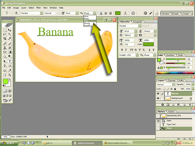 در نوار Options نوع لبههای مورد نظرتان را انتخاب کنید. شفافیت تصویر، نوع پس زمینهای که متن در آن قرار دارد و اهداف کلی دیگر شما تعیین کننده این تنظیمات هستند. برای کارهای وب بهتر است از چشمانتان کمک بگیرید و تصویر مناسبی ایجاد کنید. برای کارهای چاپی سعی کنید تا گزینه Crisp یا Strong فعال باشد مگر آنکه بخواهید یک افکت نرم ایجاد کنید. روی دکمه موجود در گوشه راست بالای نوار Options کلیک کنید تا ویرایشهای اعمال شده به متن تأئید شود و لایه مربوط به متن در تصویر ایجاد گردد.تایپ کردن متن